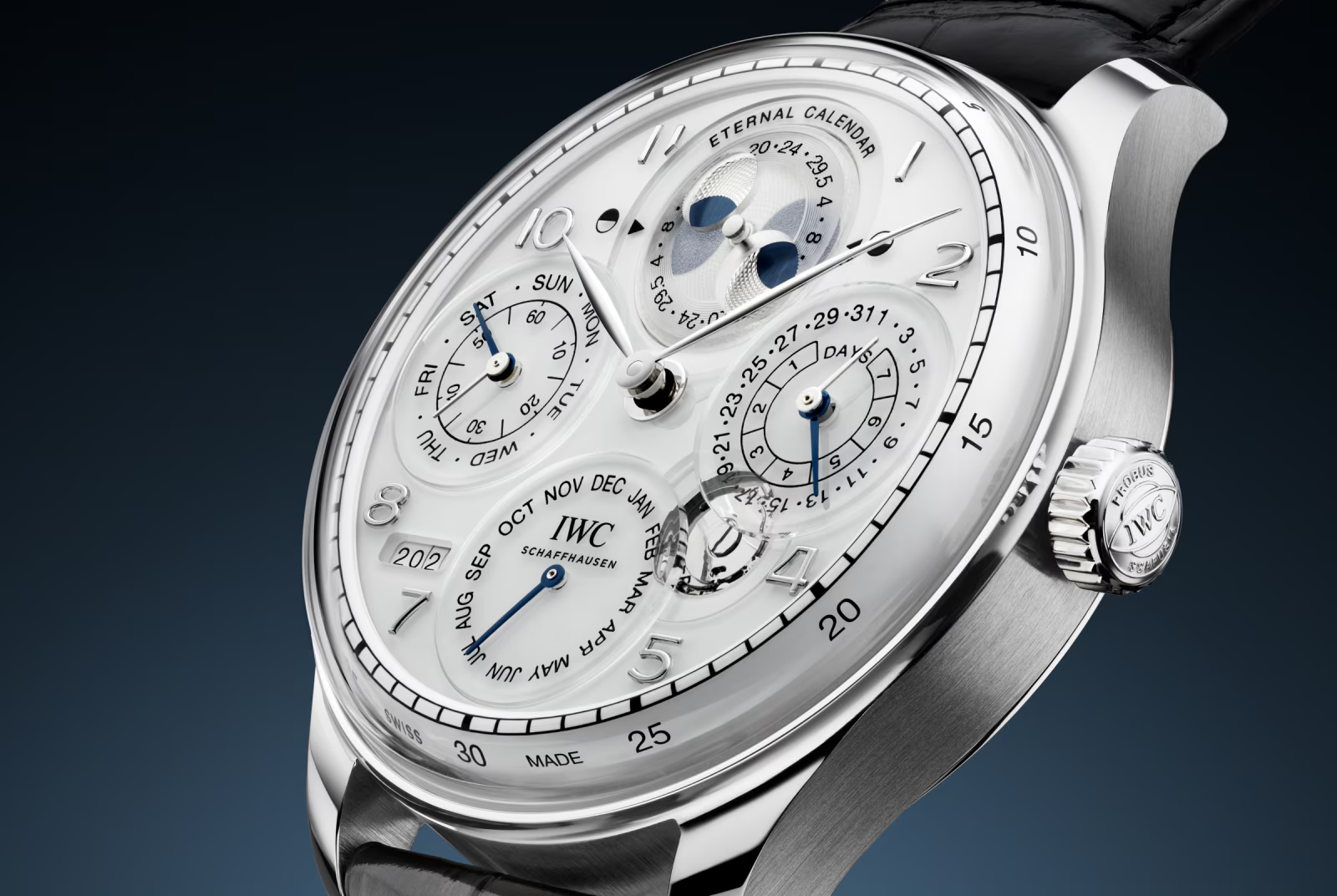 Portugieser Eternal Calendar var det urokkelige højdepunkt for IWC's bidrag til Watches&Wonders 2024. Dette ur er ikke blot en teknisk bedrift, det er en monumental præstation. Den sekulære evighedskalender betyder, at uret ikke behøver at blive justeret før 3999 takket være et 400-års gear, der overskrider de komplekse skudårsregler i den gregorianske kalender og springer tre skudår over på fire århundreder.