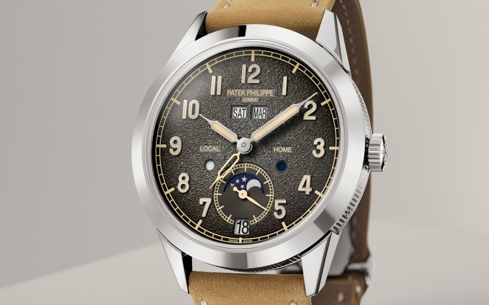 En anden unik facet af Ref. 5326G-001 er dens urskive i vintagestil. Den er udelukkende fremstillet af Cadrans Flückiger i Saint-Imier, en skivespecialist, som har tilhørt Patek Philippe siden 2004. Urskiven er koksgrå med en fin graduering til periferien og har en let granulær struktur, der minder om kasserne fra gamle dage. fotokameraer. Det er et aspekt, der hurtigt forbindes med getaways, vandrelyst og udforskning. Tiden på dagen er vist med påførte arabertal i hvidguld med beige lysende belægninger. Timerne for lokal tid og minutter vises med lysende hvidguld "Seringue"-visere, der med deres lange spidser ligner sprøjter. En gennemboret "Seringue"-viser angiver timerne hjemme. De tre åbninger i den årlige kalender – ugedag og måned på én linje klokken 12, dato klokken 6 – viser let læselige sorte inskriptioner på hvid baggrund. To små runde vinduer mærket "LOCAL" klokken 8 og "HOME" klokken 4 er dag/nat-indikatorer for henholdsvis lokal tid og hjemmetid. Dette afbalancerede arrangement suppleres af de sekundære sekunder, der fejer månefasens blænde ved 6-tiden. Kalenderindikationerne kan justeres ved hjælp af små korrektorer i sagsbåndet placeret i nærheden af de respektive funktioner: dag kl. 10, måned kl. 2, dato kl. 4 og månefaser kl. 8. Vintage-aspektet understreges med et let hævet kassedesign safir-krystal glas.